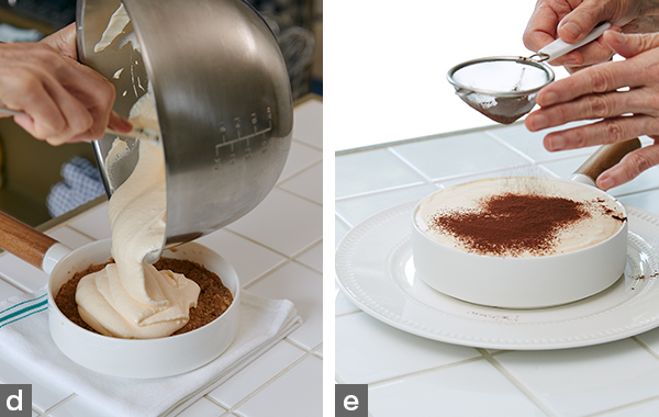 - 8. (2)の型に(7)のマスカルポーネクリームを入れる(写真d)。平らにならし冷蔵庫で冷やしてなじませる。表面にココアパウダーをふり(写真e)、取り分けていただく。