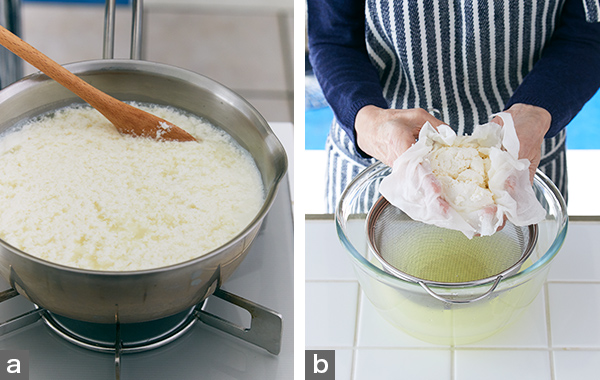 - 1. 鍋に牛乳を入れて火にかけ、軽く煮立ったらレモン汁を加えて手早く混ぜ、火を止める。少しおいて分離したら(写真a)、ボウルにペーパータオルを敷いたざるをのせてこす。