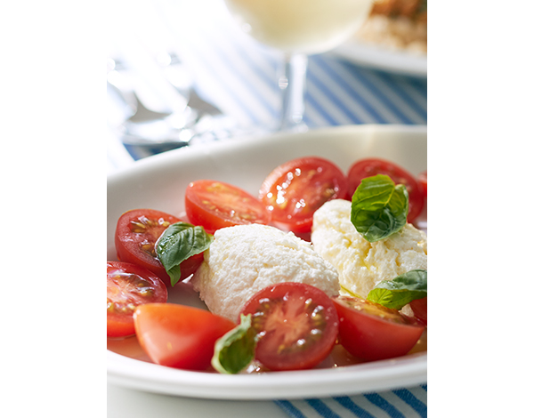 カッテージはスプーンなどで形を整えて器に盛り、ミニトマトはヘタを取って横半分に切り、カッテージに添える。冷蔵庫でよく冷やし、塩、オリーブ油を適量かけ、バジルをのせていただく。