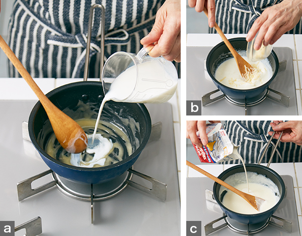 - 1. チーズクリームソースを作る。小さいフライパンにバターを熱し、薄力粉を加えて炒め、温めた牛乳を少しずつ加えてのばす(写真a)。とろみがついたらチーズを加えて溶かす(写真b)。クリームを加えてなめらかに混ぜ合わせ(写真c)、塩、こしょうで味を調える。