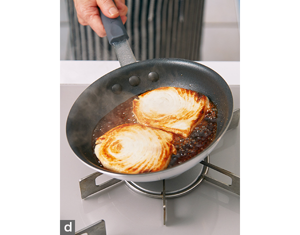 - 4. フライパンをペーパータオルなどで拭き取り、Aの調味料を加えて煮立て、軽くとろみがついたらカジキマグロを戻し入れ、照りよく煮からめる(写真d)。