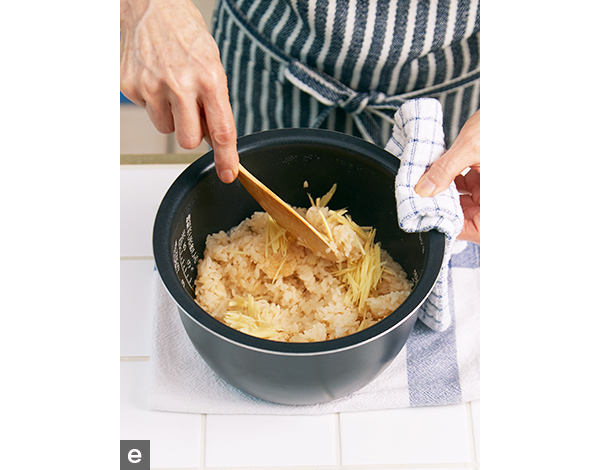 - 4. しょうがをせん切りにして(3)の炊き上がりに加えて混ぜ(写真e)、味をみて塩で調える。