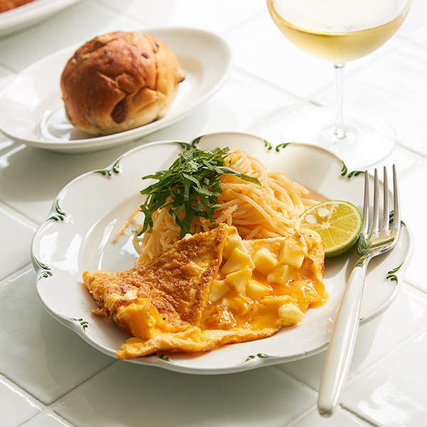 - 7. 明太子パスタとチーズオムレツを一緒に取り分け、パスタに好みですだちや青じそのせん切りをかけていただく。