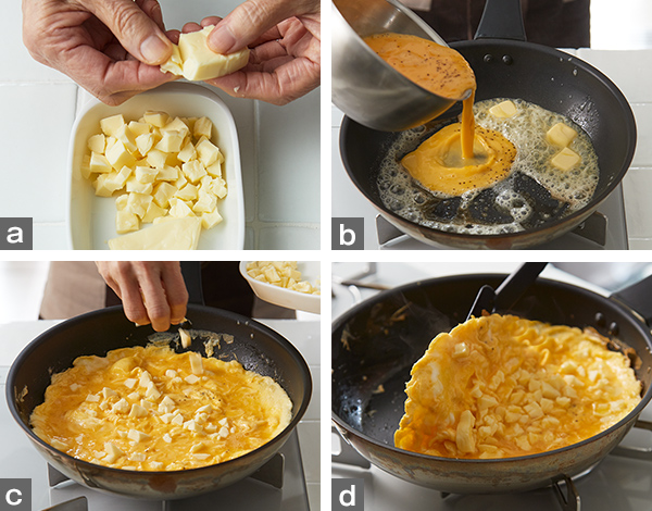 - 6. フライパンにバターを強火で熱し、溶けて十分に熱くなったら卵液を流し入れる(写真b)。大きく混ぜて全体に広げたら強火のまま加熱し、裏面に焼き色がついてまわりがふつふつとし、表面は半熟状になったらチーズを全体にちらして加え(写真c)、半分に折りたたむようにまとめ(写真d)、器に盛る。