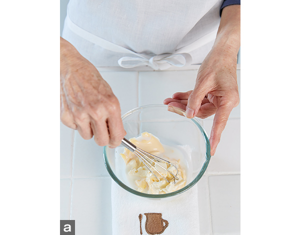 - 1. チーズドレッシングを作る。ボウルにクリームチーズを入れてやわらかくしておき、マヨネーズを少しずつ加えながらなめらかになるまでよく混ぜ、牛乳を入れて塩、こしょうで味を調え(写真a)、冷蔵庫で冷やしておく。