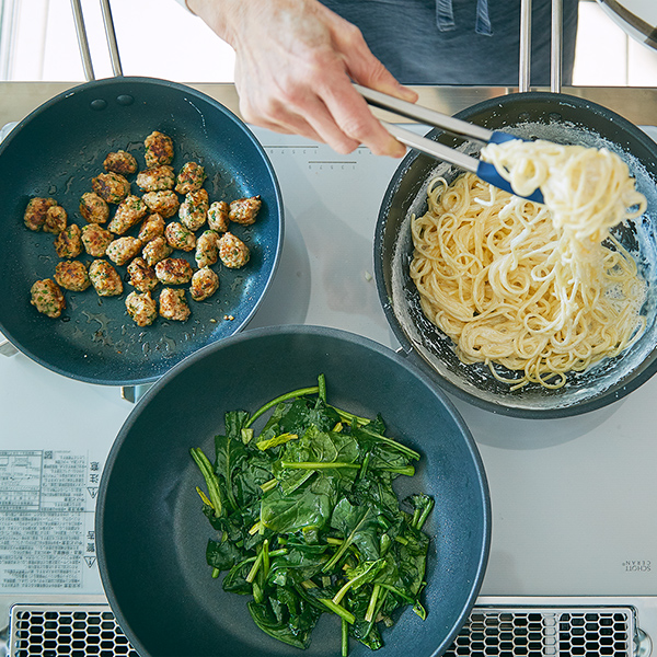 パスタは袋の表示時間の半分ほどゆでてから、牛乳とにんにくの鍋の中で食べごろのかたさまで火を通します。できたてはもちろん、パスタが少し冷めてミルクを吸った感じも意外においしいです。サルシッチャはイタリアのソーセージのこと。ここではひき肉に香味を加えてひと口サイズに焼きました。野菜のバター炒めはそのときある青菜やきのこなどで気楽に。