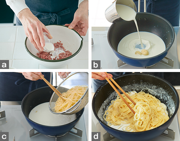 - 4. 鍋に牛乳とつぶしたにんにくを入れて火にかけ(写真b)、煮立ったら(3)のパスタを加え(写真c)、塩適量を入れて弱めの中火で混ぜながら約7分煮る。牛乳が残るくらいで火を止め(写真d)、塩、こしょうで味を調える。