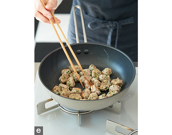 - 5. (4)のパスタのでき上がりに合わせてフライパンにオリーブ油を熱し、(1)を焼きつけ、カリッと焼いて中まで火を通す(写真e)。