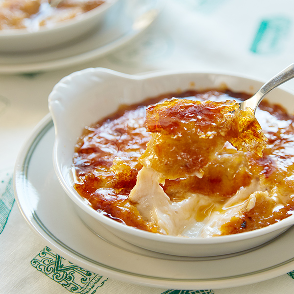 - 4. 食べる直前に冷蔵庫から出し、表面に三温糖をまんべんなくふる。バーナーであぶって飴状になるまで加熱し(キャラメリゼ)、冷ます。表面が固まったらスプーンで割りながら中のバナナヨーグルトと一緒にいただく。