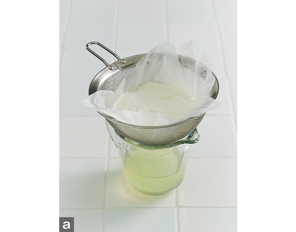 - 1. ボウルにざるを重ねてペーパータオルを敷き、ヨーグルトを入れてラップをし、冷蔵庫に入れて1~2時間以上おいて水切りをする(写真a)。