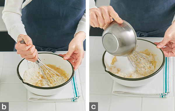 - 2. ボウルにバナナをくずしながら入れ、さらに泡立て器で細かくつぶしながらよく混ぜる。(1)の水切りヨーグルトを加え、泡立て器で空気を入れるようによく混ぜ(写真b)、グラニュー糖を加える(写真c)。