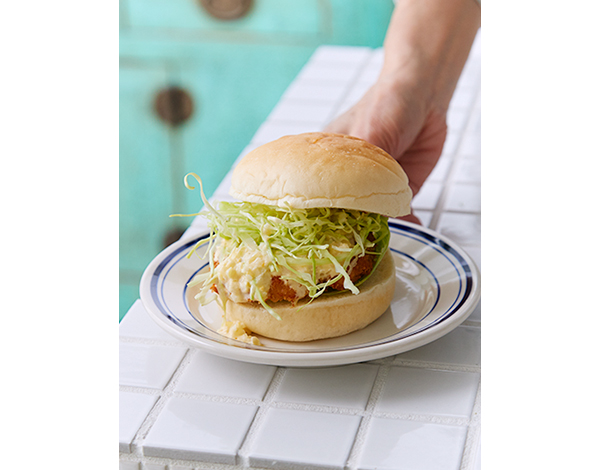 バーガーバンズにレタスを敷いて白身魚のメンチカツをのせ、トマトケチャップ、クリームタルタルソース各適量をかけ、キャベツのせん切りをのせてサンドする。