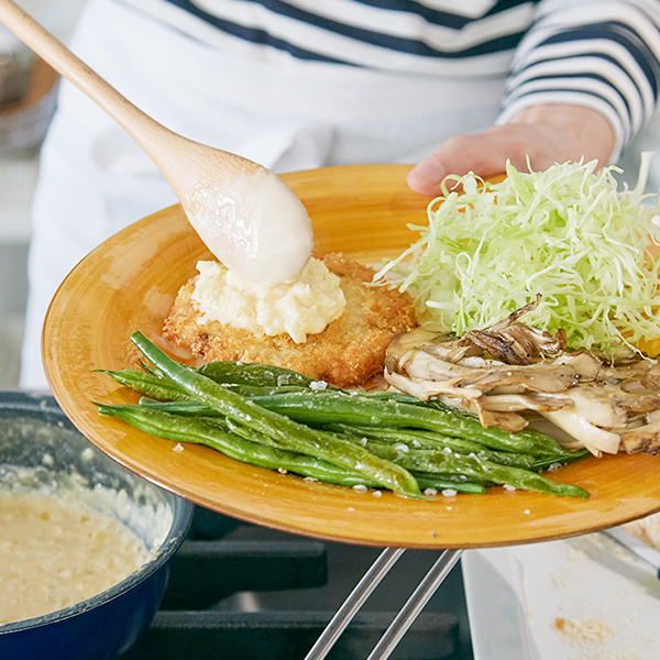 - 6. 器に盛り、クリームタルタルソースをかけていただく。キャベツのせん切り、いんげん、まいたけのグリルを添える。
