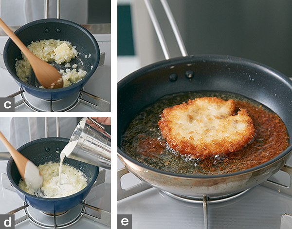 - 4. クリームタルタルソースを作る。玉ねぎはみじん切りにする。フライパンにバターを熱し、玉ねぎを入れて(写真c)食感を残して炒めたら、クリームを加え(写真d)、煮立ったら卵黄を加えて火を止め、手早く混ぜてなじませ、塩、こしょうで味を調える。