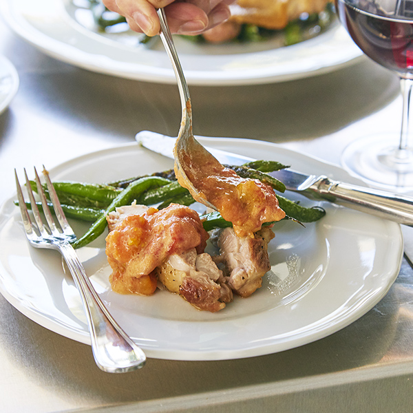 この料理のポイントは、チキンの皮をカリッと焼き上げること。コツは、皮を下にしてフライパンに入れ、チキンの上にひとまわり小さなフライパンや鍋などの重しをのせて、ぎゅーっと押しつけながら焼くのです。こうすることで、鶏から脂が出て、皮がカリカリに。 またトマトソースも生のフルーツトマトを蒸し焼きにすると、トマトから水分が出てうまみが凝縮され、より深い味を引き出すことができます。パンにもソースをつけながら、まろやかなトマトソースのおいしさを味わってみてください。サラダがわりのさやいんげんは、たっぷり添えるのがおいしいです。
