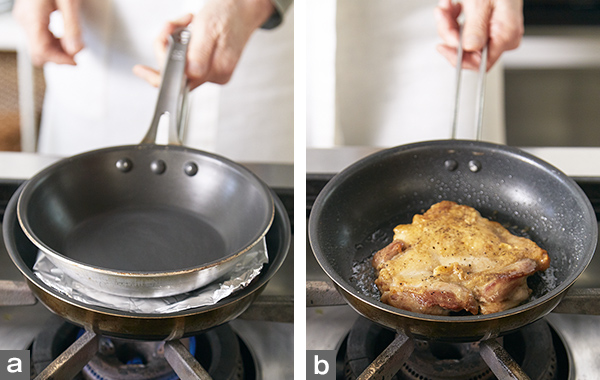 - 2. フライパンに油をひかずに鶏肉を皮目から入れてアルミホイルをのせ、ひとまわり小さいフライパンなど(重さのあるもの)をのせて火にかける(写真a)。中火~弱火を調整しながら5~7分加熱する。皮目に焼き色がついたら上下を返してホイルをはずし、さらに約5分加熱し、肉に8分通り火が通ってきたら再び皮目を下にし、皮がパリッとするまで1~2分中火で焼く(写真b)。