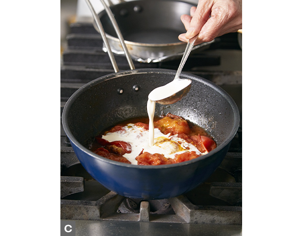 - 4. 鶏肉の焼き上がりに合わせてトマトクリームソースを作る。にんにくはたたいてつぶし、トマトはヘタを取る。鍋にオリーブ油とにんにくを入れて火にかけ、香りが出たらトマトを加えて蓋をする。中火から弱火で約5分、蒸し焼きにする。トマトがやわらかくなったらマッシャーなどでトマトを粗くつぶし、クリームを入れて(写真c)、塩、こしょうで味を調えて火を止める。