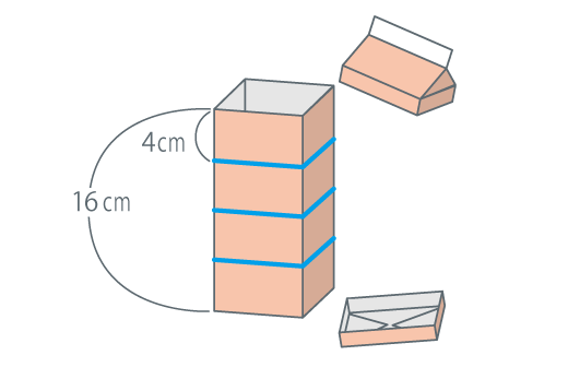 のこりの牛乳パックの、屋根(やね)と底(そこ)を切り取ります。箱をたいらにしてから、4cmの幅(はば)で4つに切ります。