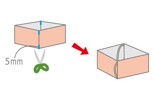 むかいあった2か所の角に、上下5mmずつ切りこみを入れ、輪ゴム(わゴム)をはさみます。