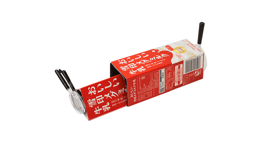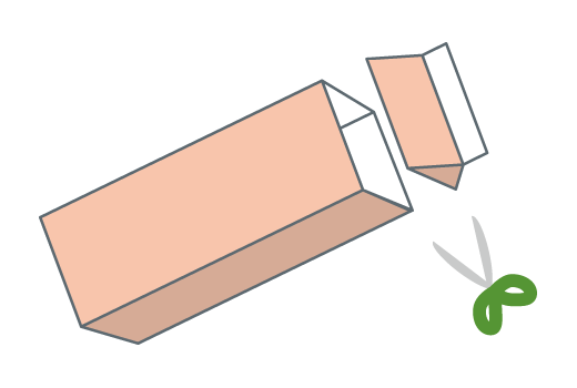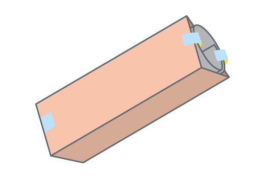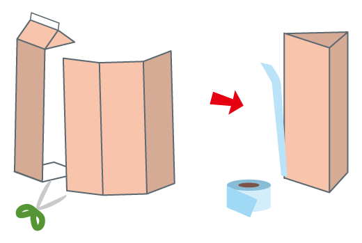 のこりの牛乳パックを切りひらいて、三角の筒(つつ)を作ってセロハンテープでとめます。