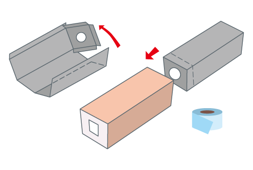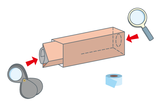 三角の筒(つつ)を四角の筒の中にいれます。三角の筒にむしめがねを2こ重ね(かさね)てビニールテープでとめます。四角い筒には、むしめがね1こをはりつけます。
