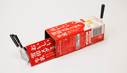 〈あ〉の黒画用紙をくみたてて、〈2〉の牛乳パックに入れてセロハンテープでとめます。