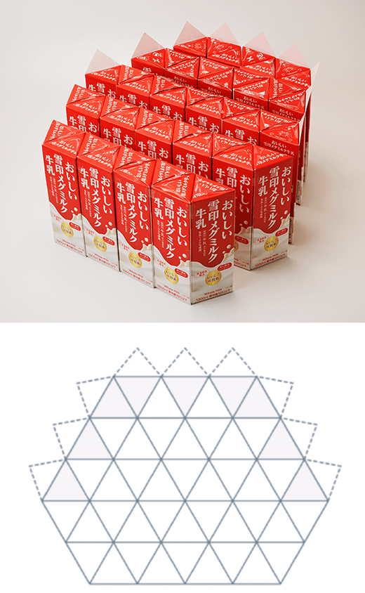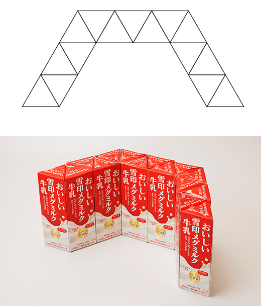〈3〉の三角柱(さんかくちゅう)を47こ使って〈5〉の要領(ようりょう)で台座(だいざ)を作ります。型(かた)どりしたダンボールで補強(ほきょう)します。