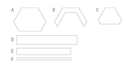 図のA~Fを各(かく)1まいずつ切ります。(A~Cは各1cm、D~Fは各5cmぬいしろをつけて切ります) -