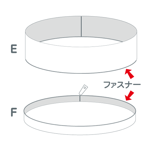 EとFを輪(わ)に縫(ぬ)ってからファスナーをつけます。