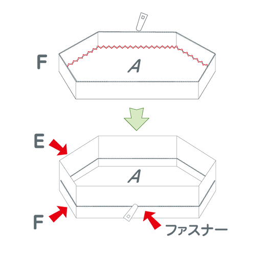 FとAを縫(ぬ)い合わせ、Eをファスナーでとめます。