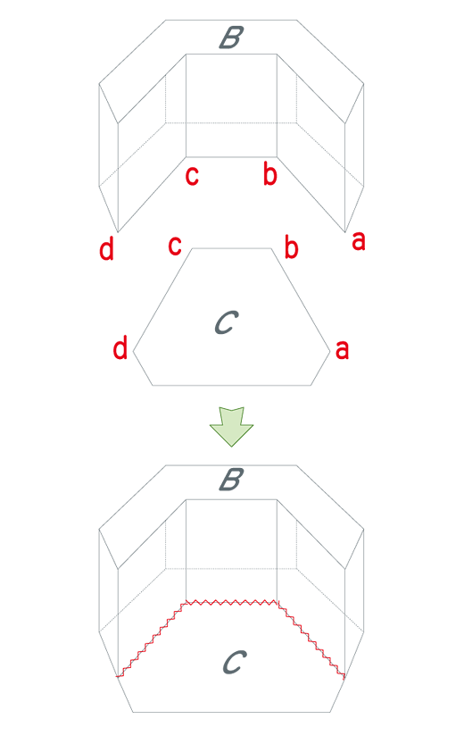 〈4〉とCを記号(きごう)をあわせて縫(ぬ)い合わせます。