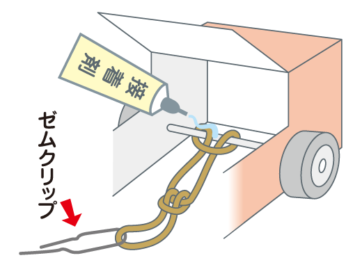 後輪(こうりん)の車軸(しゃじく)に図のように2本の輪(わ)ゴムをかけます。輪ゴムをひっぱり瞬間接着剤(しゅんかんせっちゃくざい)で車軸に固定(こてい)します。