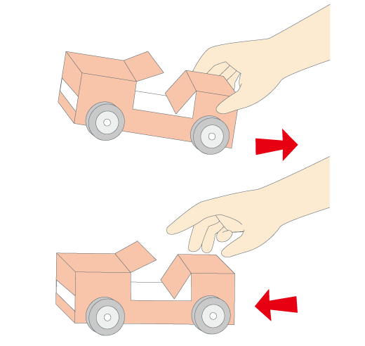 後輪(こうりん)のタイヤを軽く押(お)さえて車をバックさせ、車軸(しゃじく)に輪(わ)ゴムを巻(ま)きつけていきます。