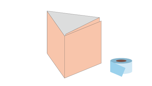 〈6〉で切った7.5cm×28cmは、図のように三角柱(さんかくちゅう)になるようにおり重ね(かさね)、テープでとめます。