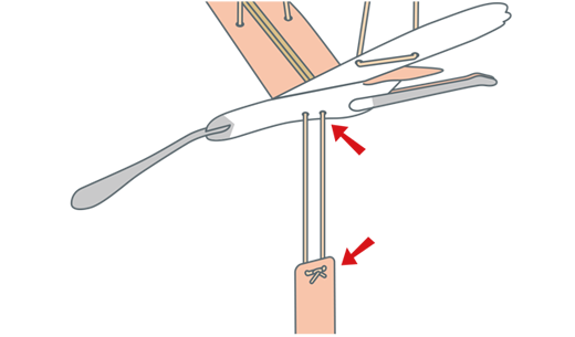 胴体にも、〈1〉の図面で印したところに穴をあけます。穴にたこ糸を通し、おもりにも通してむすびます。