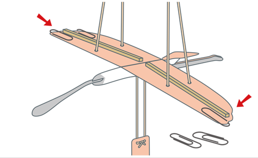 つばさの先にクリップをつけて、つばさが水平(すいへい)になるように、バランスをとります。