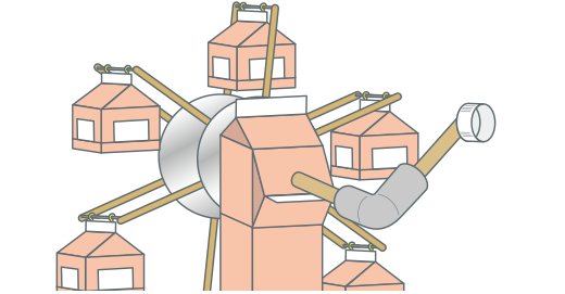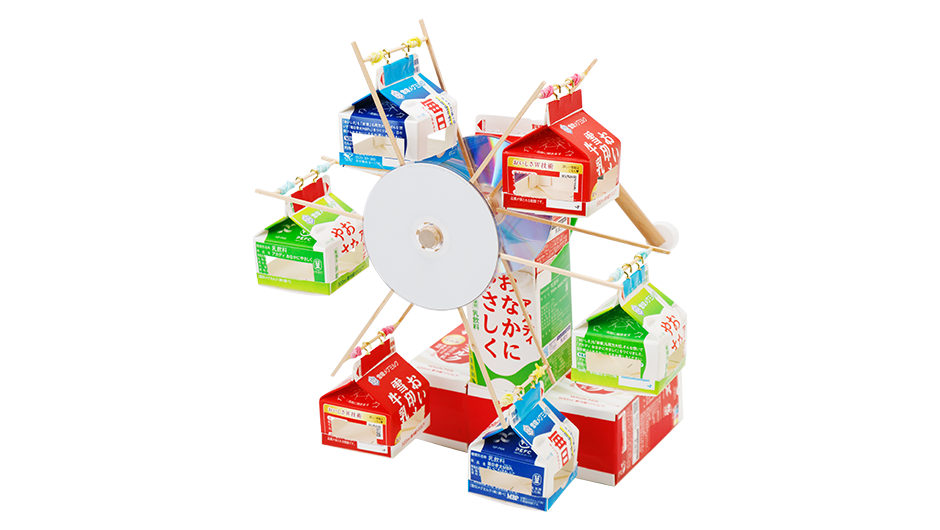 ※ここでは、水道管(すいどうかん)などに使われる継手(つぎて)、丸棒、ペットボトルのキャップを使いしました。みなさんも、いろいろ工夫(くふう)してみてね。