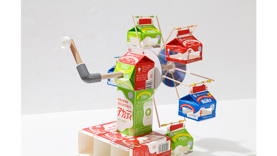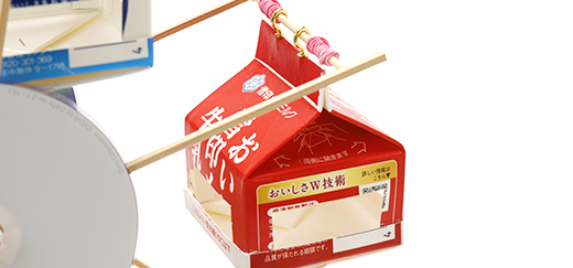 ※ぐらぐらする場合(ばあい)は、下の3本の牛乳パックの中に、砂や粘土(ねんど)など、重りになるものを入れましょう。