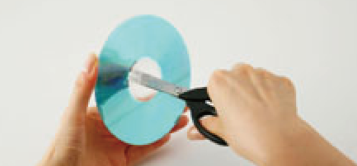 CDは、5枚全部の穴(あな)に、丸棒(まるぼう)が入るように、はさみなどで穴の大きさを調節(ちょうせつ)します。