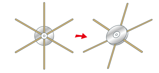 ディスクの中心から、60度の間隔(かんかく)で、角材(かくざい)6本を、接着剤(せっちゃくざい)で固定(こてい)します。