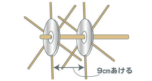 〈2〉に丸棒を通し(とおし)ます。あいだを9cmあけて、接着剤で固定します。