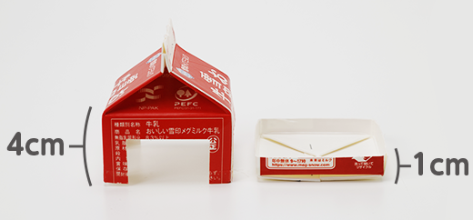 牛乳パックを図のように、屋根(やね)の下から4cmのところで切り取り、窓(まど)をあけます。