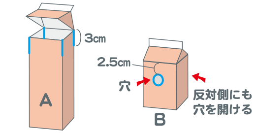 500mlの牛乳パックは、上から2.5cmのところに、丸棒を通す(とおす)穴をあけます。
