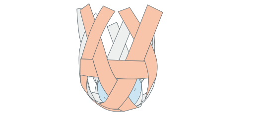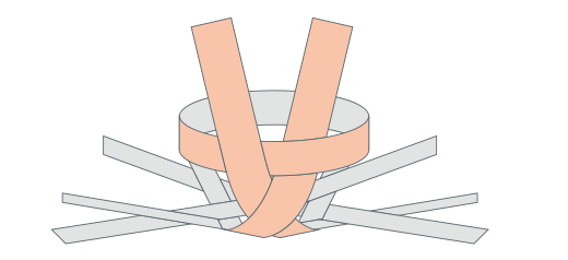 輪の上でそれそれのオビを、反対どなりのオビと交差(こうさ)させます。