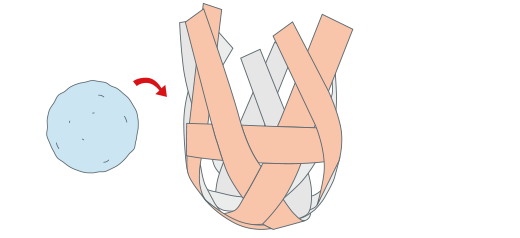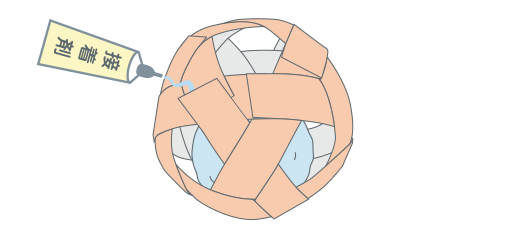 オビの両はしを、それぞれ接着剤でとめます。この時、オビが上、下、上、下となるようにしていき、ボールの形を完成(かんせい)させます。