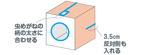 〈A〉の底の真ん中に、虫めがねより少し小さい円を、切り抜きます。上側(うえがわ)に、虫めがねの柄(え)を差し込める幅(はば)に、切り込みを入れます。側面(そくめん)にも、3.5cmの切り込みを入れます。外側(そとがわ)の筒(つつ)の中に入れやすくするためです。