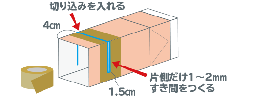 切り口から4cmのところを、図のように1.5cm残して切り込みを入れます。切り込みは、片側(かたがわ)だけ1~2mmのすき間にして、フィルムをスライドさせやすくします。 -