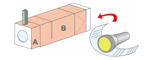懐中電灯(かいちゅうでんとう)の前方(ぜんぽう)に、気泡緩衝材(きほうかんしょうざい)などを巻きつけ、〈B〉に差し込みます。