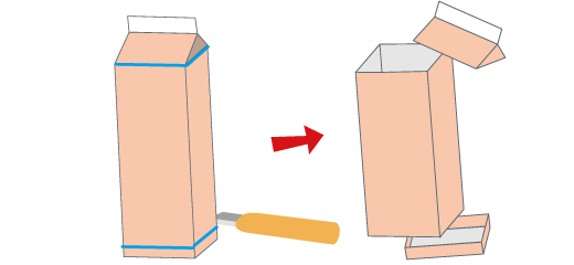 牛乳パックの、底( そこ) を切る時は、とても硬い( かたい) ので、大人( おとな) の人にてつだってもらいましょう。