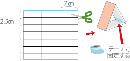 〈2〉で残った胴体部分を2.5cm幅(はば)に切ったら、それぞれを三角形に折り、テープで固定します。それを25こ作ります。